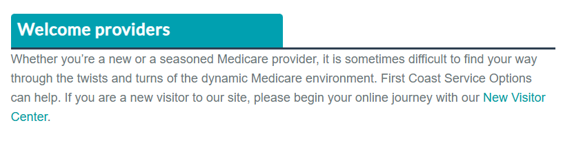 Welcome Providers: This guides providers to learn more about First Coast and also includes a link to our New Visitor Center.